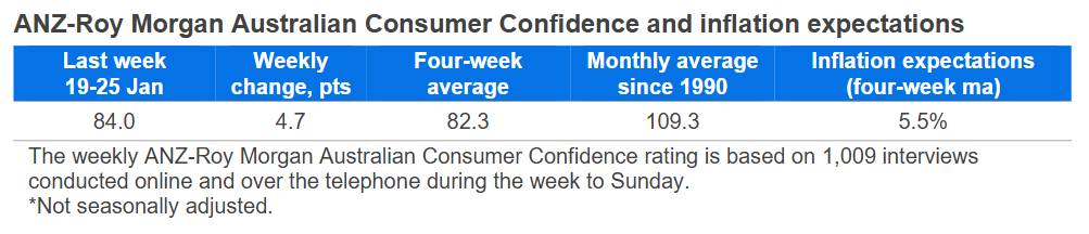 "Last week’s improvement was driven by improving household confidence in their current finances and economic conditions over the next year, likely supported by strong labour market data. ‘Weekly inflation expectations’ dropped ahead of this week’s Q4 2025 CPI release. We forecast a 0.8% q/q increase in trimmed mean inflation in Q4, which should see the RBA keep the cash rate on hold at 3.60% at its February meeting."