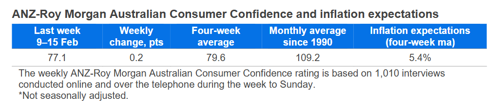 "ANZ-Roy Morgan Australian Consumer remains very weak at 77.1 points, having dropped 3.4 points since the RBA increased the cash rate to 3.85 per cent.," ANZ Economist, Sophia Angala said.